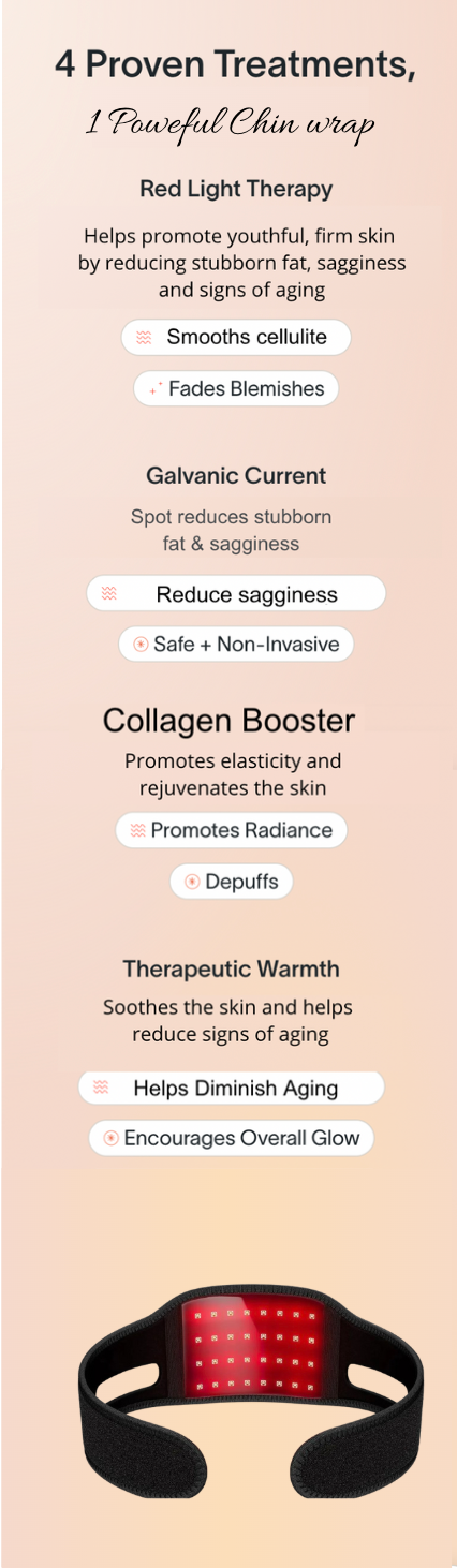 The Neck Wrap is the marvel we've all desired. It boasts Red Light Therapy for deep rejuvenation, Galvanic Current to reduce sagginess , Vibrating Massage to combat puffiness and promote elasticity, and Therapeutic Warmth to reduce signs of aging. Once tried, it becomes an indispensable ally.